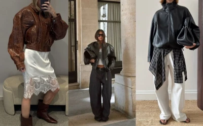 Večerné kombinácie sú ešte zaujímavejšie. Hodvábne čipkované šaty alebo dokonca maxi sukne vrstvené s nohavicami sa v zahraničných editoriáloch objavujú veľmi často, najmä v kombináciách s koženými bundami v tmavých odtieňoch. Koža tak slúži ako pevný prvok, ktorý dodáva outfitu šmrnc. A čo je skvelé, aj keď ide o veľmi ženský štýl, kožená bunda mu dáva hravosť a uvoľnenosť.